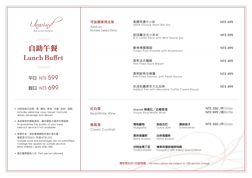 Unwind Bar and Restaurant's semi-buffet style luncheon provides diverse dining options in a casual and cozy environment settingSemi-buffet style lunch to please your palette, serving buffet salad bar and an optional gourmet entree choice.